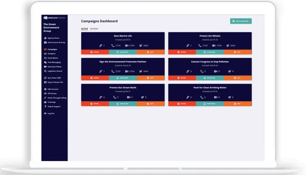 Metrics you’ll see: message delivery reach, advocate engagement, advocacy-to-action conversion rates, and ROI by campaign or client.